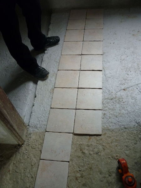 師傅先將磁磚在地上一字排開 預抓含縫隙的長度