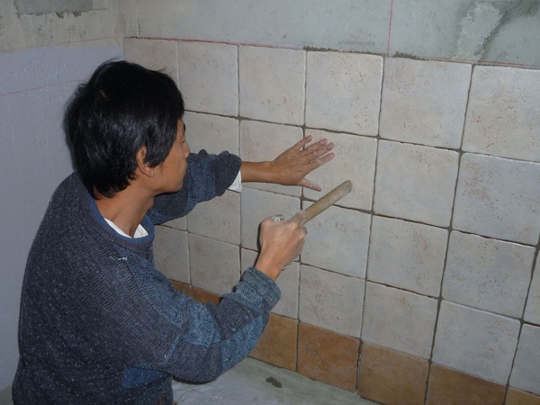 貼幾片後用鐵鎚背輕敲磁磚讓接合更緊實