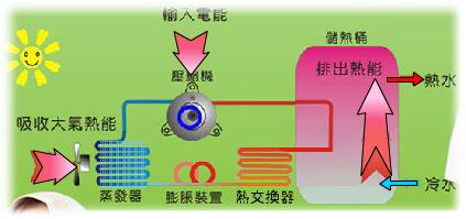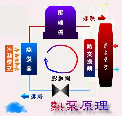 熱泵簡易說,就是將太陽能照射地球所產生的熱能回收再利用,如冷氣機運轉時利用冷媒,吸收室內的空氣,將冷空氣和熱空氣分離,讓我們在室內享受冷氣。而熱空氣排放在室外,熱泵原理則是將空氣中的熱,經過壓縮機加壓和收集,再以熱交換器轉換成熱水的熱泵設備,將冷水逐漸加溫成為熱水,僅需極少的電能,便能達到人體最舒服並可以接受的水溫(40~60度C),是目前最環保也最省能源之置熱設備。每一個人都吹過冷氣,冷氣機主要是由壓縮機及一些熱交換器組成,其內充灌冷媒。冷氣機通電後從空氣中吸取熱量,使空氣降溫,便產生了冷氣。另外,冷氣機也會往外排出熱氣,由能量不滅原理來看,這些熱氣的能量將等於輸入冷氣機的電能,加上從冷氣房所吸取的熱量,而排出的熱氣能量會高於輸入電力的二到六倍。