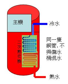 使用時出來的熱水即是銅管二次熱交換出來的, 並非原桶內之熱水.
